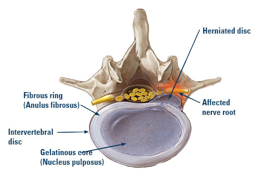 The intervertebral discs are located between the vertebral bodies. They consist of a gelatinous, elastic core (nucleus), which is held in shape by a surrounding fiber ring (annulus). Normal aging processes or overloading can cause cracks in the fiber ring. Consequently, parts of the nucleus pulposus can be pushed through the annulus into the spinal canal.