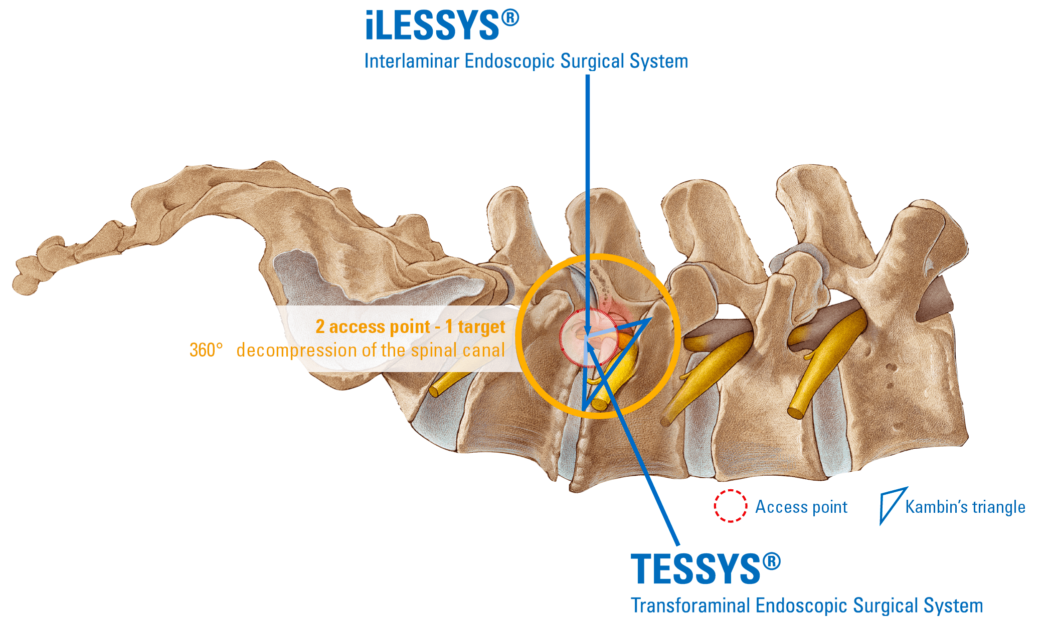 TESSYS® and iLESSYS® offer two alternative minimally invasive endoscopic approaches to the spinal canal. Generally all lumbar levels can be treated with either approach.